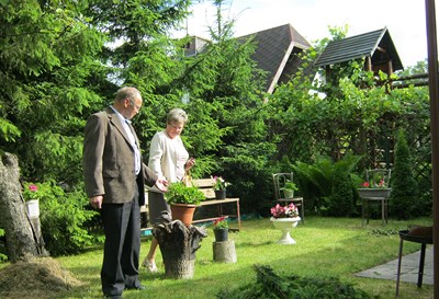 Wizytę kończymy na działce państwa Piezga, gdzie pani prezesowa pokazuje nam sadzonki kwiatów, którymi została zafascynowana w czasie ubiegłorocznych wakacji. w innych regionach Polski.