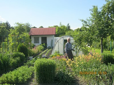 Z ciepłą atmosferą. Pod koniec naszego spaceru mamy przyjemność gościć na działce pani Anny i jej małżonka. Trzy lata temu przejęli zaniedbany kawałek ziemi. Stworzyli tu mieszkanko dla ogrodowego kota i domek dla jeża. Pasją pani Anny są lilie. Sama krzyżuje odmiany, jest posiadaczką orientalnej lilii Kuszimaja (przepraszam, jeśli pisownia jest inna) unikatowej w naszym kraju. Charakteryzuje się zapachem, innym rano i innym wieczorem.