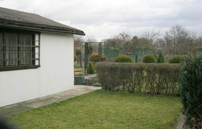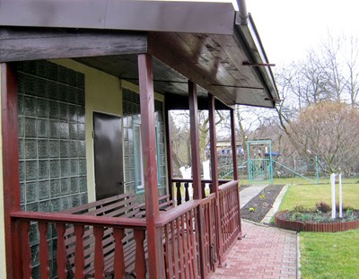 Zaraz za tą ostatnią bramą znajduję się świetlica ogrodu (zielony budynek po lewej stronie).
