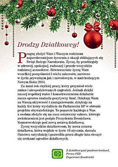 "W imieniu polskich działkowców składam na ręce Pana Prezydenta serdeczne podziękowanie za podpisanie w dniu 18 grudnia 2013 roku nowej ustawy o rodzinnych ogrodach działkowych. Jest to z pewnością najlepszy prezent świąteczny, jaki mógł Pan Prezydent podarować milionowi obywateli, korzystających z działek rodzinnych w polskich ogrodach" - czytamy w podziękowaniach Prezesa PZD Eugeniusza Kondrackiego