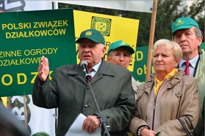 Kilkanaście tysięcy działkowców przy dźwiękach trąbek, gwizdków i wuwuzeli, powiewając związkowymi flagami i balonikami w kolorze żółto-zielonym, manifestowało 10 października br. pod Sejmem RP i Kancelarią Prezesa Rady Ministrów. – Witam wielką polską rodzinę działkowców w Warszawie mówił Prezes Eugeniusz Kondracki witając przybyłych z całej Polski użytkowników działek.