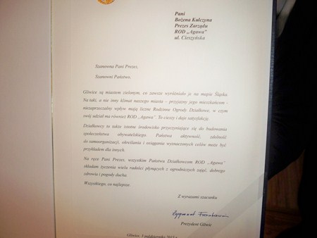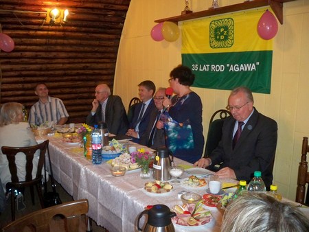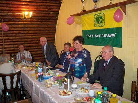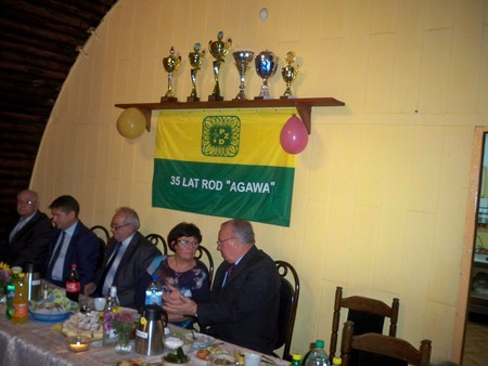 Prezes ROD,, Agawa’’ pani Bożena Kulczyna na wstępie powitała działkowców przybyłych oraz Przewodniczącego Rady Miasta Gliwic Pana Marka Przonaka i Przedstawicieli Delegatury Rejonowej w Gliwicach o osobach; Członka KKR oraz w-ce przewodniczącego OKR OZŚL. Pana Zenona Jabłońskiego. Przewodniczącego Delegatury Rejonowej w Gliwicach pana Stanisława Kalisza i Kierownika Delegatury Rejonowej PZD w Gliwicach. Następnie przedstawiciele delegatury wręczyli Puchar ufundowany przez OZŚl. z okazji 35-lecja, oraz puchary ufundowane przez Delegaturę Rejonową dla ROD za zajęcie I miejsca w Konkursie / Rodzinny Ogród Działkowy Roku 2015/ i dla Państwa Aliny i Mariana Sroczyńscy za zajecie I miejsca w konkursie /Wzorowa Działka Roku 2025/ wręczono jeszcze wiele dyplomów dla działkowców za udział w konkursie /Wzorowa Działka Roku 2015/ Przewodniczący Rady Miasta Gliwic Pan Marek Przonak w imieniu Prezydenta Miasta Gliwic na ręce Prezesa ROD Pani Bożeny Kulczyny wręczył list, w którym miedzy innymi czytamy/Działkowcy to także istotne środowisko przyczyniające się do budowania społeczeństwa obywatelskiego. Zdolność do samoorganizacji, określenia i osiągania wyznaczonych celów może być przykładem dla innych. Po części oficjalnej nastąpił smaczny poczęstunek i rozpoczęła się zabawa taneczna, do której przygrywał świetny zespół.
