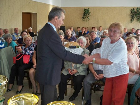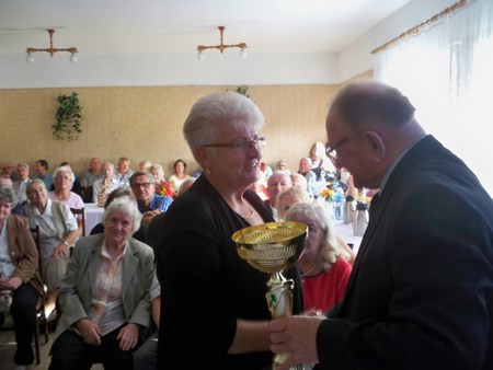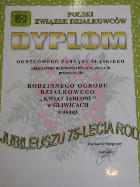 Na spotkaniu przedstawiciel delegatury PZD Gliwice Pan Zdzisław Kowalik wręczył puchar jubileuszowy wraz z dyplomem na ręce Prezesa Pana Zenona Bitkowskiego. Jubileusz 75-lecia był połączony z dożynkami, na których najlepsi działkowcy zostali uhonorowani odznaczeniami związkowymi PZD, nagrodami i dyplomami. Po części oficjalnej odbyła się zabawa do białego rana.