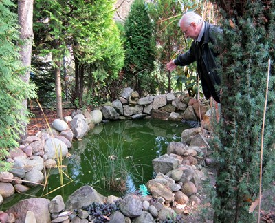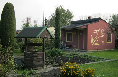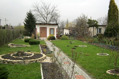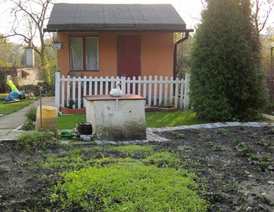 W ogrodzie jest pszczelarz i gołębiarz. Po jednym, ale są. Spacerując zwracamy uwagę na małe, urokliwe oczka wodne na działkach..