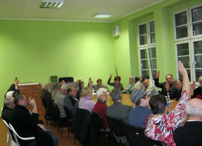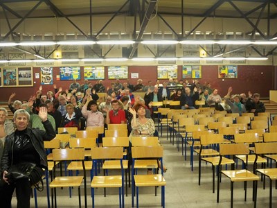 To już jedno z ostatnich zebrań w ogrodach Gliwickiej Delegatury. Zebranie działkowców ROD Georginia odbyło się w Sali Rady Osiedlowej przy Szkole Podstawowej nr11. Wszyscy działkowcy zostali powiadomieni o zebraniu listami poleconymi. Pani prezes Maria Chojak rozpoczęła zebranie o godz. 15 tej. Jako prowadząca zebranie odczytała porządek i regulamin. Następnie dokonano wyboru Komisji Mandatowej i Komisji Uchwał. Po przegłosowaniu wszystkich decyzji Komisja Mandatowa stwierdziła, że obecnych jest 31,3% działkowców, co uniemożliwia podjęcie Uchwały. Pani prezes zamknęła zebranie pierwszego terminu. W czasie przerwy naświetliłam działkowcom sprawę zagrożenia altan. Działkowcy wystosowali swoje stanowisko w tej sprawie do pana Marszałka Sejmu. Omówiłam również najważniejsze zmiany, które wniósł nowy Statut PZD.