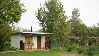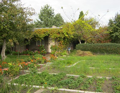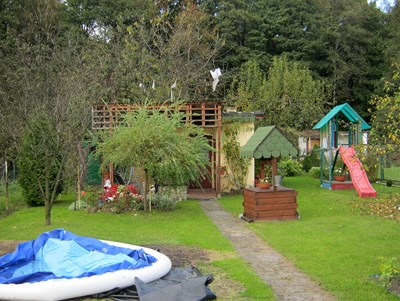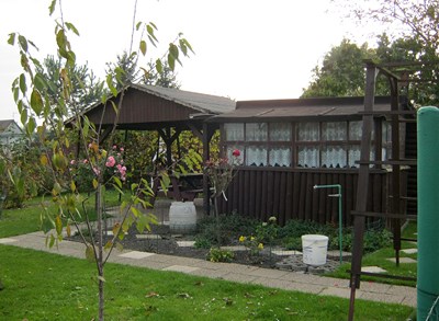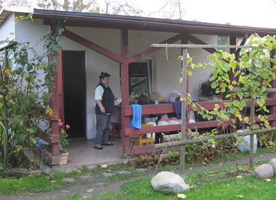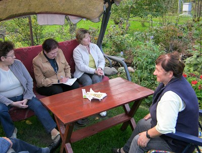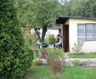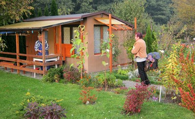 Nasza druga wizyta w tym ogrodzie jest już wcześniej umówiona z Zarządem. Przed Domem Działkowca wita nas vice prezes ogrodu. Właśnie trwają rozmowy na temat wynajęcia na imprezę tego ładnego, zadbanego budynku. Takie okazje rzadko (1-2 razy w roku) się zdarzają a dają dodatkowy pieniądz dla ogrodu. Mając prąd i wodę mogą sobie na to pozwolić.