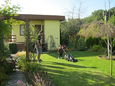 W ogrodzie gospodaruje też coraz więcej młodych działkowców. Antek (mam nadzieję, że dobrze zapamiętałam imię) już stara się naśladować tatę przy obsłudze kosiarki.
