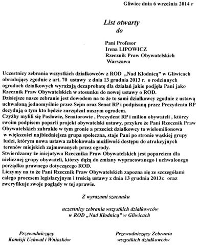 W dniu 06.09.2014 r. w ROD ,,Nad Kłodnicą '' w Gliwicach odbyło sie zebranie wszystkich działkowców celem wyboru stowarzyszenia które będzie zarządzać ogrodem. Zebranie odbyło sie w świetlicy ROD ,,Górnicza Radość ''.Zebranie otworzył witając działkowców oraz Kierownika Biura Delegatury Prezes ROD pan Tadeusz Kosowski. Oraz jednocześnie przeprosił działkowców o niedogodności i konieczności odbycia tego zebrania w wynajętej sali odległej od własnego ogrodu. Następnie zaproponował na przewodniczącego zebrania Pana Mieczysława Kosakowskiego kandydatura została jednogłośnie przegłosowana.Przewodniczący odczytał porządek i regulamin zebrania które zostały jednogłośnie przyjęte. w dalszej kolejności dokonano wyborów Komisji Mandatowej i Komisji Uchwał i Wniosków.Po ukonstytuowaniu sie w/w komisji przewodniczący oddał głos Komisji Mandatowej. Komisja Mandatowa na podstawie listy obecności stwierdziła ze na 490 wszystkich działkowców którzy zostali powiadomieni zgodnie art. 69.ust.2 ustawy o ROD w zebraniu uczestniczy 115 działkowców co stanowi 23,47% Komisja Mandatowa stwierdza że dzisiejsze zebranie wszystkich działkowców odbywające sie w I terminie jest niezdatne do podejmowania uchwały,o której mowa w art.70 ust. 1 ustawy o ROD z powodu braku obecności co najmniej polowy liczby działkowców.Przewodniczący zebrania zakończył zebranie w I terminie i poinformował zebranych ze zebranie w II terminie odbędzie sie o godz .10,00 zgodnie z zawiadomieniem które otrzymali wszyscy działkowcy listem poleconym. W przerwie głos zabrał Kierownik Delegatury który omówił wyrok NSA w sprawie altan zwracając uwagę czym ten wyrok może grozić działkowcom jeżeli nie zostanie zmieniony zapis w Prawie Budowlanym dotyczący altan. W dalszym wystąpieniu omówił pismo RPO skierowane do wicepremier Elżbiety Bieńkowskiej.oraz projekt statutu.