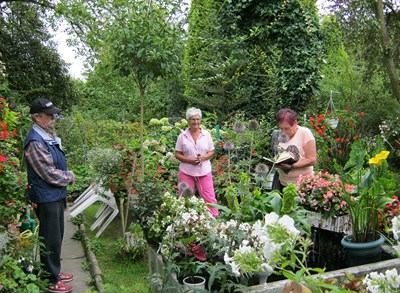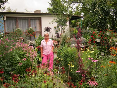 Docieramy do działki prezesa gdzie wita nas pani Basia-żona prezesa. Ma się, czym pochwalić, tu zagospodarowany jest każdy kawałek ziemi. Ilość gatunków roślin, ich wyjątkowość jest do po zazdroszczenia. Urocze brunety, gaury świetnie komponują się z kilkoma gatunkami paproci i trawą hakonechloa. Oprócz flory i fauna jest tu bogata. Oczko wodne i jego okolice zamieszkują żaby, jaszczurki i zaskrońce. Obserwacji tego środowiska nie zastąpi żaden telewizor-popieram słowa pani Basi!