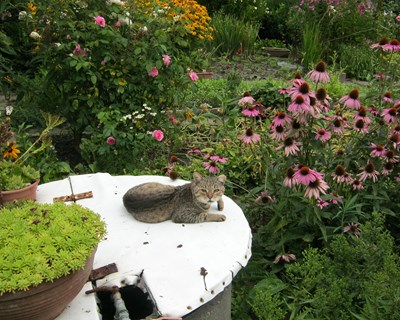 Jak każdy porządny ogród i BUDOWLANI mają swojego kota. Filip, bo tak ma na imię, majestatycznie raczył rzucić na nas okiem. Jeszcze przy kawie u pani Jasi Banasik omawiamy szczegóły zebrań wszystkich działkowców wybierających przynależność do stowarzyszenia. Syci wrażeń(i nie tylko) żegnamy ten gościnny ogród. BUDOWLANI to ROD z górnej półki!