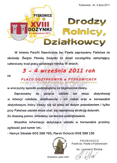 Przedstawiciele Delegatury Gliwice Polskiego Związku Działkowców, zostali zaproszeni przez Biskupa Gliwickiego księdza Jana Wieczorka na Dożynki Diecezjalne, organizowane przez Kurię Diecezjalna w Gliwicach. Dożynki odbędą się 18 września w sanktuarium Matki Bożej Pokornej w Rudach.